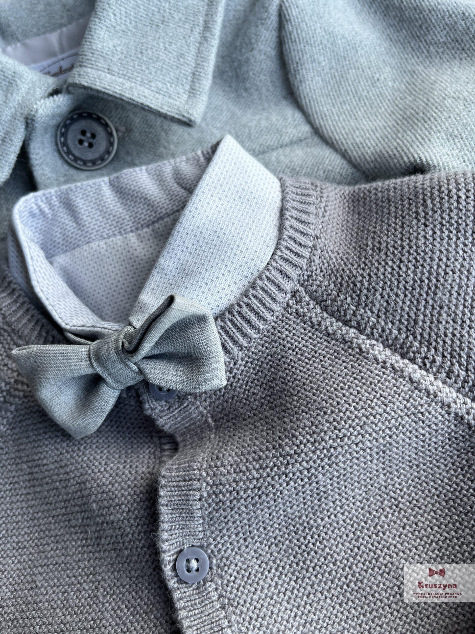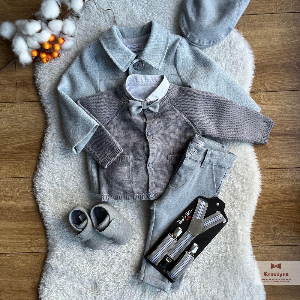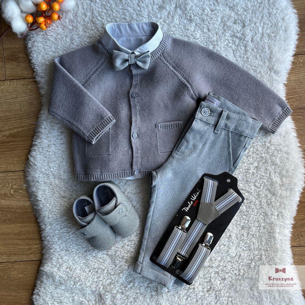 Szara stylizacja łącząca w sobie mięciutki sweterek marki Mayoral wraz z dodatkami od Abrakadabra: szare spodnie, muszkę oraz koszulobody. Świetnie komponuje się z pasującym kolorystycznie kaszkietem, szelkami czy modnymi bucikami. Stylizacja polecana i na elegancko i na casualowo.